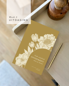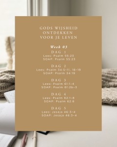 Pauzeer deze week steeds even als je onrust of zorgen voelt opkomen. Stop met wat je doet en bid Psalm 94:19 of Filippenzen 4:6-7. Schrijf op: Waar maak ik me zorgen over? Wat is Gods waarheid op dit moment? Breng die zorg bij Hem en vervang je zorg door Zijn belofte.