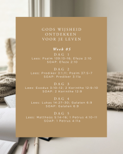 Vraag God om je één manier te laten zien waarop je jouw talenten of jouw verhaal deze week mag inzetten voor Zijn eer. Wacht niet tot het groot of indrukwekkend genoeg voelt; zet trouw de kleine stap die Hij je voorlegt.